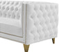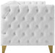 Upholstered in soft white faux leather, this Michelle sofa is sumptuously glamorous. Designed for upscale living, this chair features rich gold nail head trim and gold iron legs that keep it grounded in contemporary beauty. Tufted material covers every inch of this unit, and button tufting ensures that the unit stays plump and comfortable and holds up well to continual use. Pair it with other items in the collection for a cohesive look.