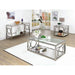 RYLEE Chrome Coffee Table, Chrome, 47 1/4"L X 23 1/2"W X 18 1/2"H, 72.16lbs. Elegant trellis-inspired tables with a glossy finish. This radiant piece designed of metal construction showcases mirror and glass shelves, offering a breath of fresh air to liven up any dull living space. Available in 2 colors. Features: Contemporary Style Side Circle Accents 3mm Mirror Open Circle Panel Accents 8mm Tempered Glass and Beveled Glass Top Metal Frame Chrome or Champagne