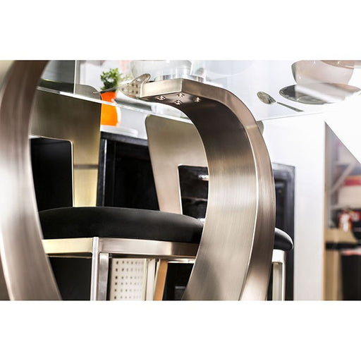 NOVA Silver/Black Side Chair (2/CTN), 18 1/4"W X 20 1/2"D X 35 3/4"H, 37.4lbs. A beautiful satin plated powder coating, matching the metal chair frames. Relax in style as the padded microfiber cushions offer comfort while the black upholstery complements the contrasting luster of the plated finish. Features: Contemporary Style Keyhole Back Metal Frames w/ Satin Plated Powder Coating
