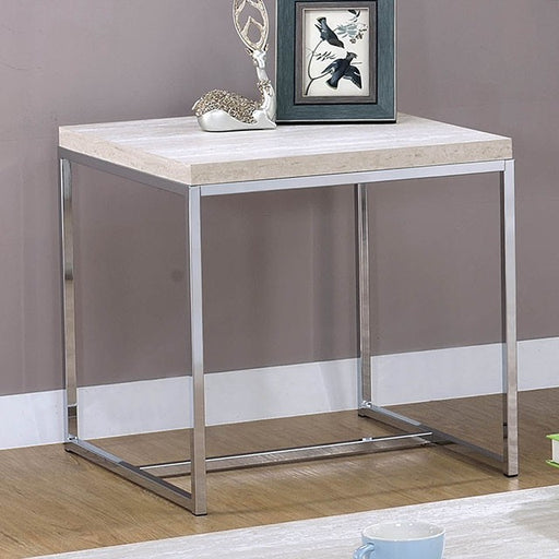 FOA EastNinove I White/Chrome End Table, 23 1/2"L X 23 1/2"W X 22"H, 53.5lbs. This contemporary set of living room tables has a unique curled shelving desi...