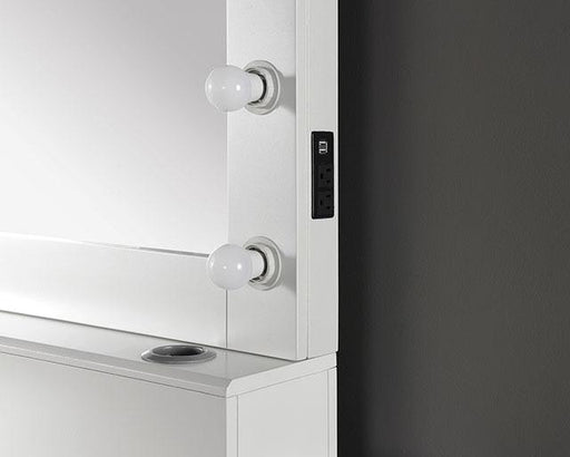 FOA EastIt's a stunning white set with an illuminated mirror, ensuring the beauty of whomever sits upon the cushioned seat.