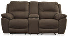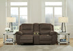 Kick back, relax, and enjoy some sports on TV with this reclining loveseat. You will love its double stuffed pillow top arms and soft-as-suede faux leather upholstery. The family-friendly dark gray color and creative stitching add panache. Recline in comfort even if floor space is limited, thanks to the space-efficient zero wall design. This bustle back loveseat with console and cup holders will always be a win.