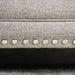 A transitional living room set with a touch of worldly charm. The loose back pillows are soft but supportive, the large rolled arms provide a nice sport to lean against and give this set a traditional look. The added throw pillows introduce some much needed color to the gray upholstery. The powder blues, oranges, damask and circle patterns pop out and contrast with each other in a way that helps break the monotony. This is the perfect blend of traditional design with modern aesthetics.