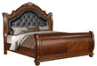 Cosmos Furniture's Viviana traditional style Queen Bed in caramel finish wood creates an elegant and traditional atmosphere in your bedroom. It is a beautifully crafted from the luxurious designs of the historical past. Viviana bed features elaborate wood carving details on the headboard, footboard and on side rails. The sleigh footboard lies at the heart of this classic bedroom set. This bed embodies timeless taste and appearance that will make any master bedroom feel refined and comfortable. The deep arched headboard has a beautifully carved crown and is combination of upholstered with faux leather, it is button tufted with expansive nail head trim.