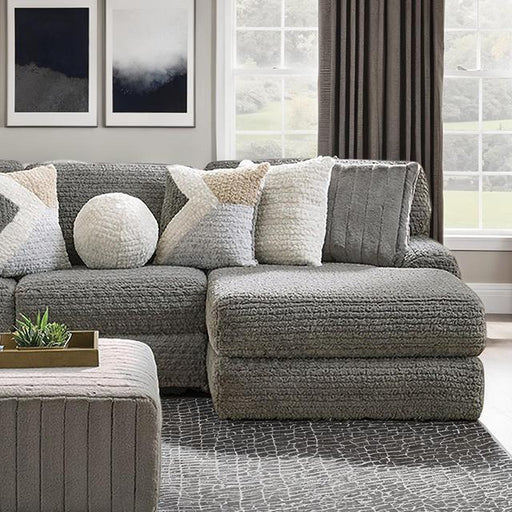 FOA EastEarl Gray Sectional, 119"L X 78"W X 34 1/2"H, 232lbs. It's hard to ignore the refreshing appeal of gray fabrics. They blend into any environment an...