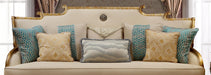 Cosmos Furniture's Majestic transitional style beige Sofa with gold finish wood. This beautiful elegant sofa set blends classic French and European inspired Victorian-era elements into one. The luxurious gold finished, plush seat support you in lavish comfort and extraordinary style. The intricately carved solid wood frame outlines the gracefully curved rolled arms. The Ornate carvings with metallic highlight to the detail work cascade across the skirts, and the mini wingback styled corners. Add this beautiful set to your living room to create a romantic and stylish space that everyone will admire. Throw pillows are included. Matching pieces are sold separately.