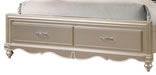 Cosmos Furniture's Faisal transitional style King Bed has champagne finished wood which is an impeccable example of truly memorable luxurious transitional design. Your bedroom will be dignified fashion with this center piece. This semi arched panel bed has a beautifully designed headboard. It is intricated tufted upholstery along with geometric wood panels which compliments the crystals inlaid headboard frame. The footboard is perfect match with carvings details and Two (2) deep Drawers to increase the functionality of this bed. The drawers have dovetail construction with full extension glides and are dust proof. Bed has turned legs along nickel with crystal finished accented hardware. Matching Nightstand and more bedroom pieces are sold separately to complete the entire look of your excellent taste.