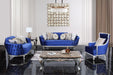 Cosmos Furniture's Skylar transitional style Sofa in blue upholstery contrasting with silver finish wood is eye pleasing comibination. A fresh take on the modern and classic style, our Skylar collection is covered in navy blue velvet for a contemporary feel. The striking set has button tufting adding texture and shape bring just the right amount of luxury. The large, deep seat cushions feature pocketed springs and velvet wraps for total comfort. The Skylar has all the appeal of a classic style with the comfort of a modern design. Throw pillows are included. Matching pieces are sold separately.